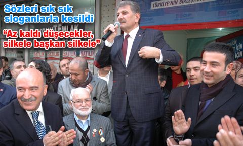 Seçim İrtibat Burosu açılışında konuşan CHP Bahçelievler Belediye Başkan Adayı Saffet Bulut, sözunu sık sık “Az kaldı duşecekler, silkele başkan silkele" sloganıyla kesen yoğun kalabalığa, “Evet duşecekler Allah doğrunun yardımcısıdır, her zaman" şeklinde cevap verdi.