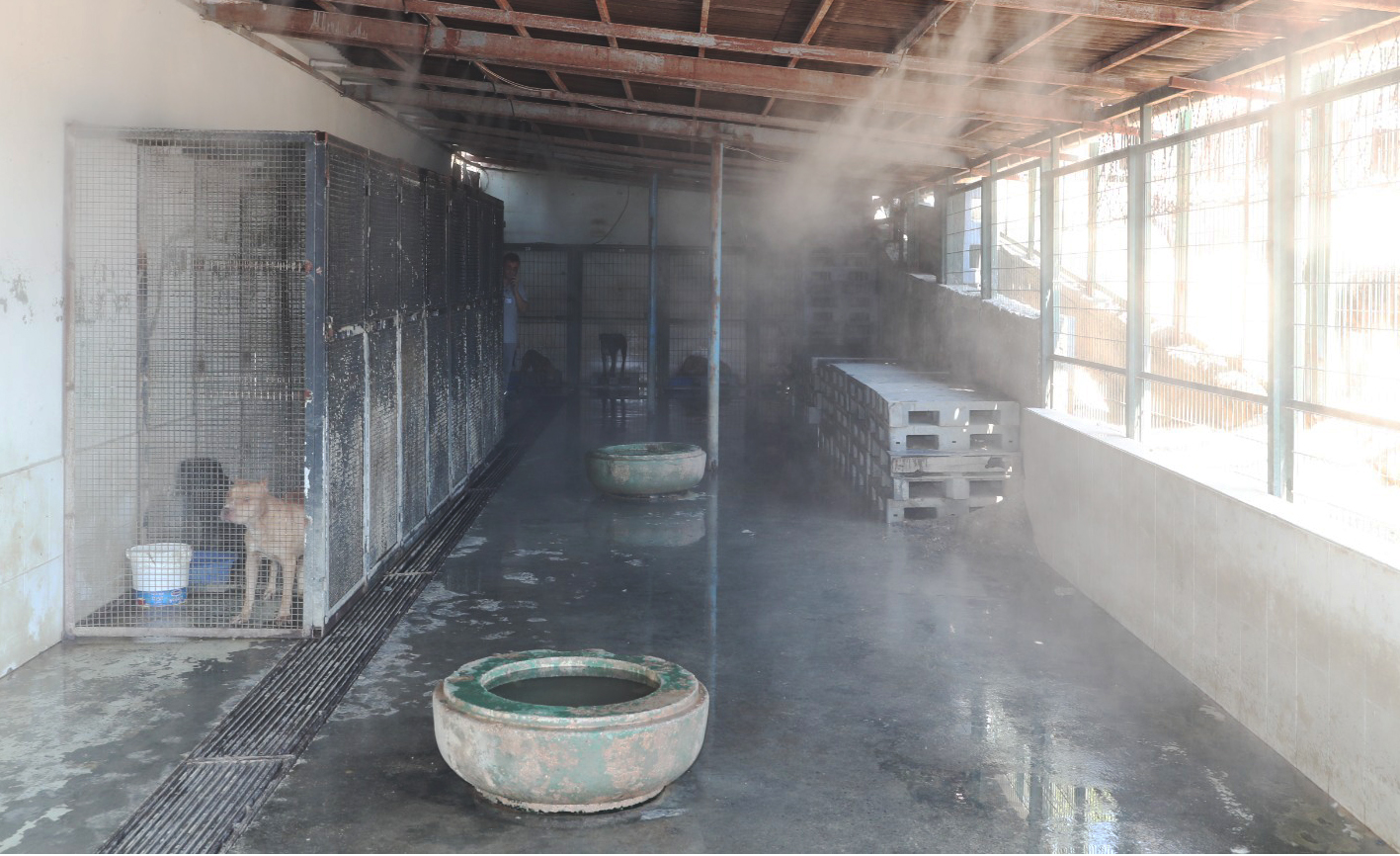 Bağcılar Belediyesi’ne ait Hayvan Barınma ve Müşahade Merkezi’nde kedi ve köpekler, sıcaklığın 36 dereceyi aştığı bu günlerde buharla serinletiliyor.